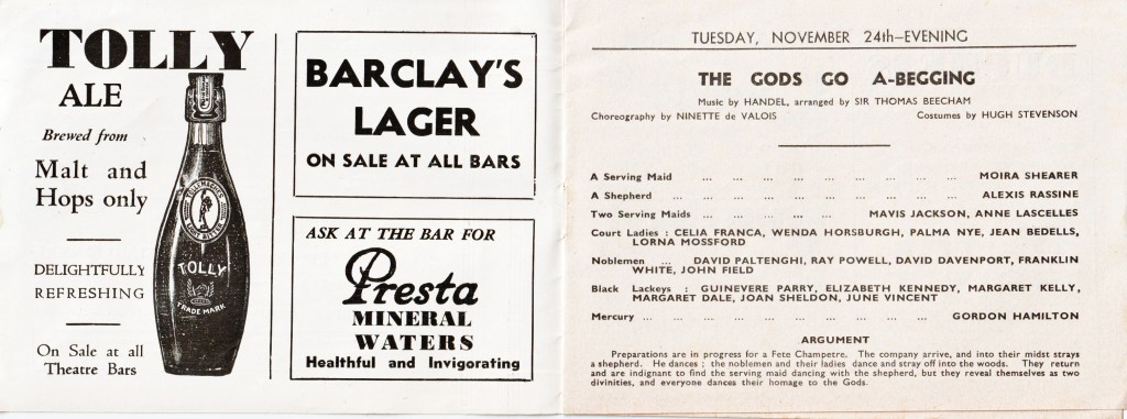 A programme for November 14th, 1942 at the New Theatre when Shearer made her first “solo” appearance as a serving maid in Ninette de Valois’ ballet, The Gods Go a-Begging.