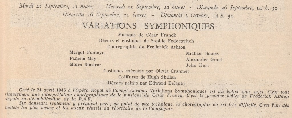 Programme for performances of Symphonic Variations at the Theatre des Champs Elysees, Paris in September and October 1948.